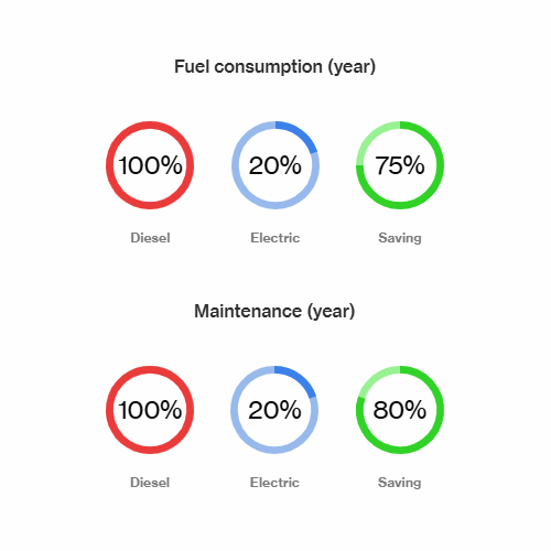 Os produtos 100% eléctricos da Tenax International oferecem uma manutenção económica e facilitada. Com uma varredora ou lavadora de ruas 100% eléctrica Tenax, os custos anuais de manutenção são reduzidos em 80% em comparação com um produto equivalente movido a combustão.